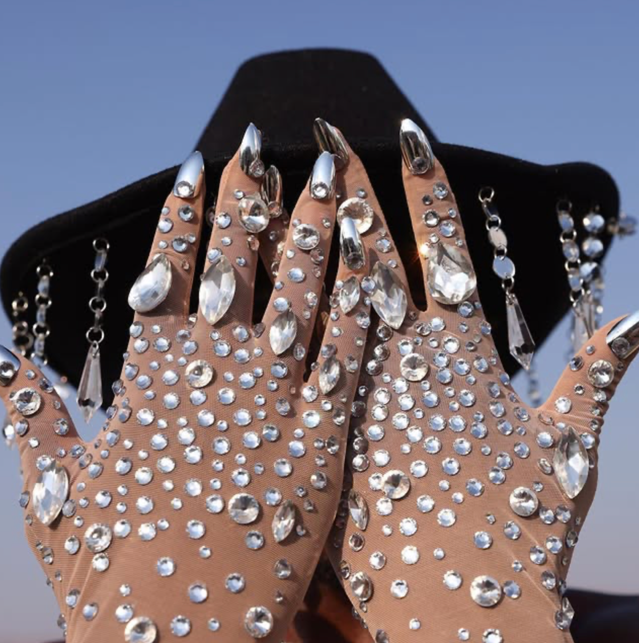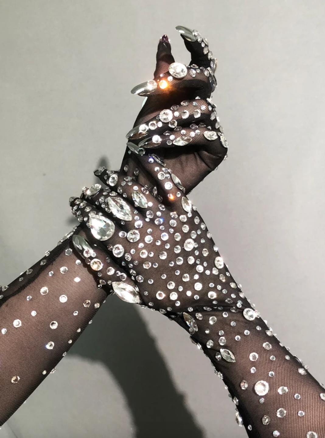 Gants en strass Costumes Vegas pour spectacles, événements, fêtes" Style : gants faits main en strass, incluant des faux ongles. Gants avec faux ongles en strass, ongles stiletto nus argentés, dorés, Swarovski. Costume en strass, costume pour spectacles Vegas, perruque de danseuses sexy en cristal, drag queen. Faux ongles argentés, ongles longs stiletto argentés. Manucure des ongles. Ongles en strass en forme de cercueil, ovales, stiletto.