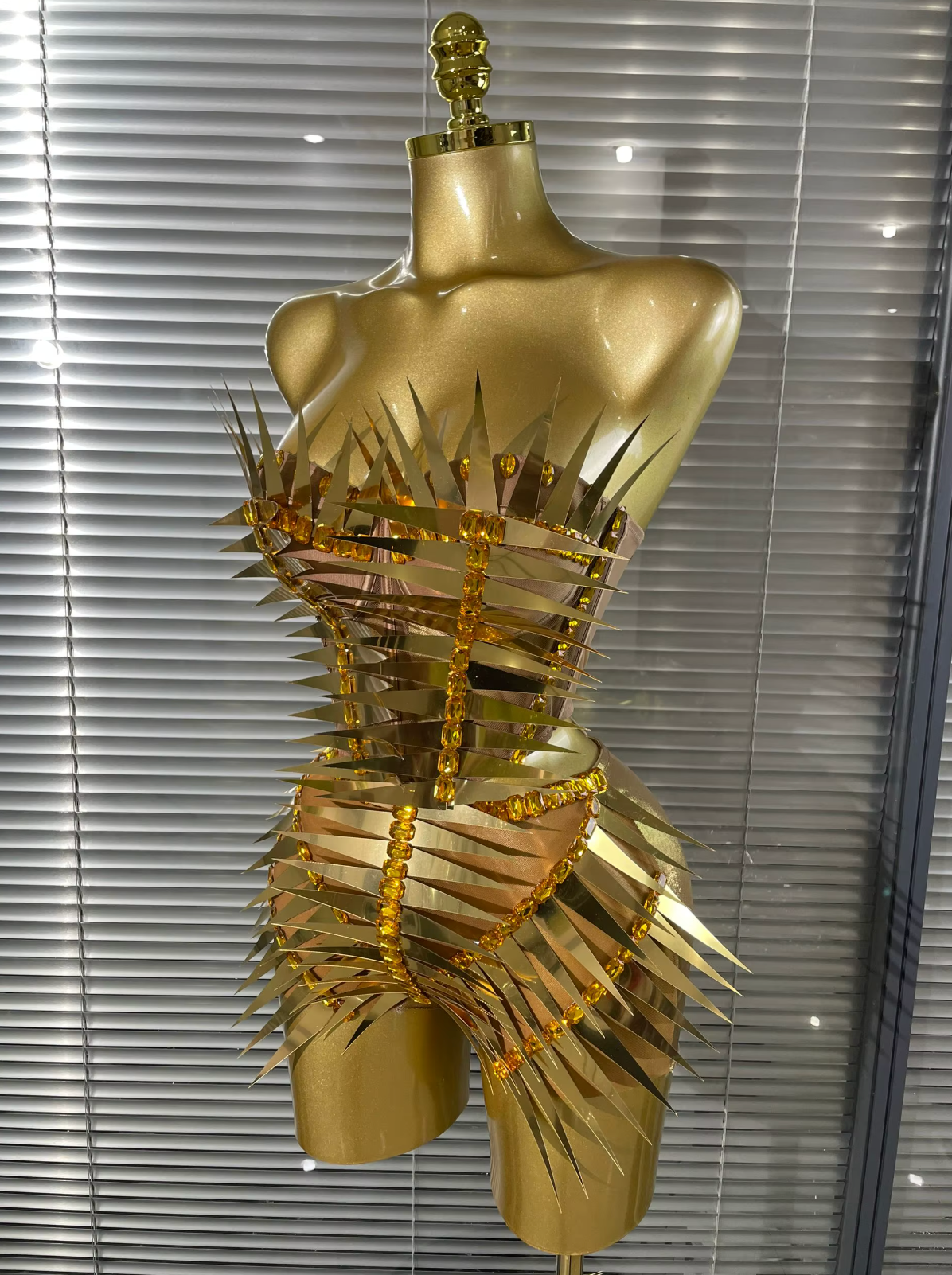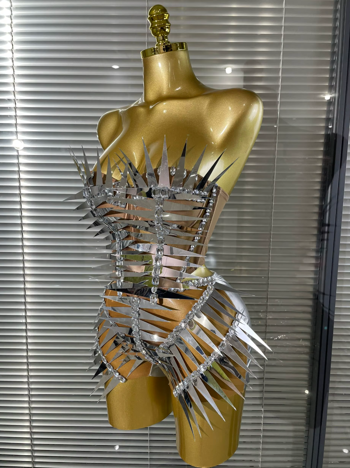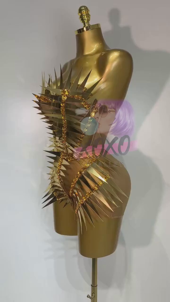 Dominez la scène dans ce Combinaison de performance à pointes métalliquesConçu pour une présence scénique audacieuse et un impact futuriste. Fabriqué avec une finition ultra-brillante. finition métallique et dramatique détail des pointes, ce combinaison argentée et dorée Il offre une esthétique blindée et de science-fiction qui brille sous les projecteurs.