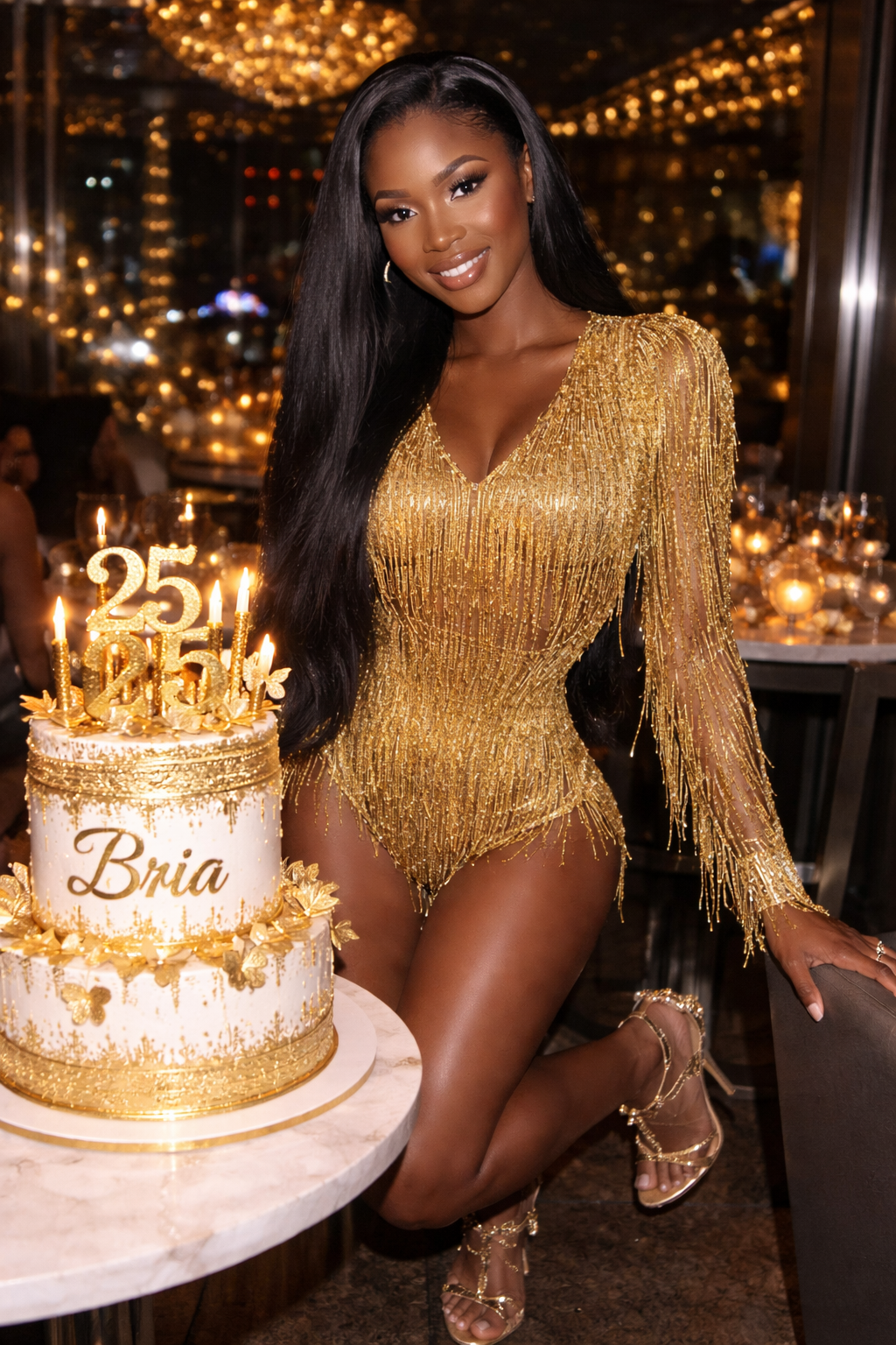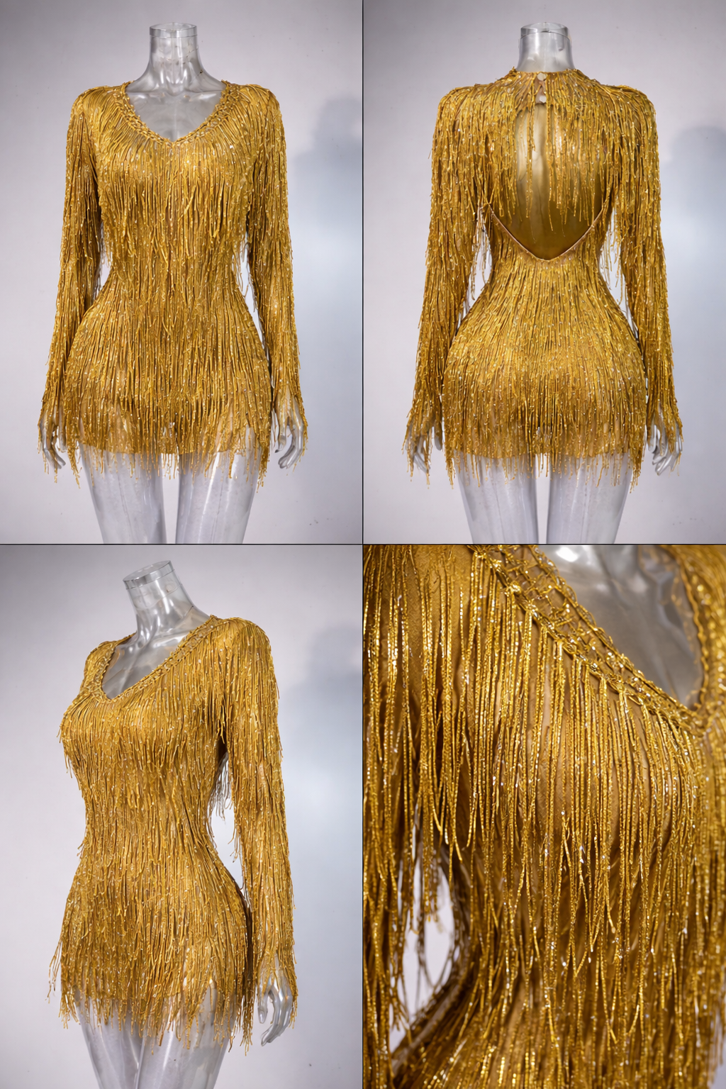 Gold Fringe Long Sleeve Bodysuit – Women’s Birthday, Festival, Rave, Concert & Performance Outfit