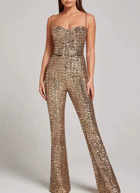 Faites sensation à la nuit tombée avec cette combinaison de soirée à sequins dorés, idéale pour les sorties nocturnes, les anniversaires et les soirées en club. Avec son décolleté bustier en forme de cœur, son tissu à sequins scintillants et sa coupe évasée flatteuse, cette combinaison est parfaite pour les fêtes, les festivals et les nuits inoubliables.