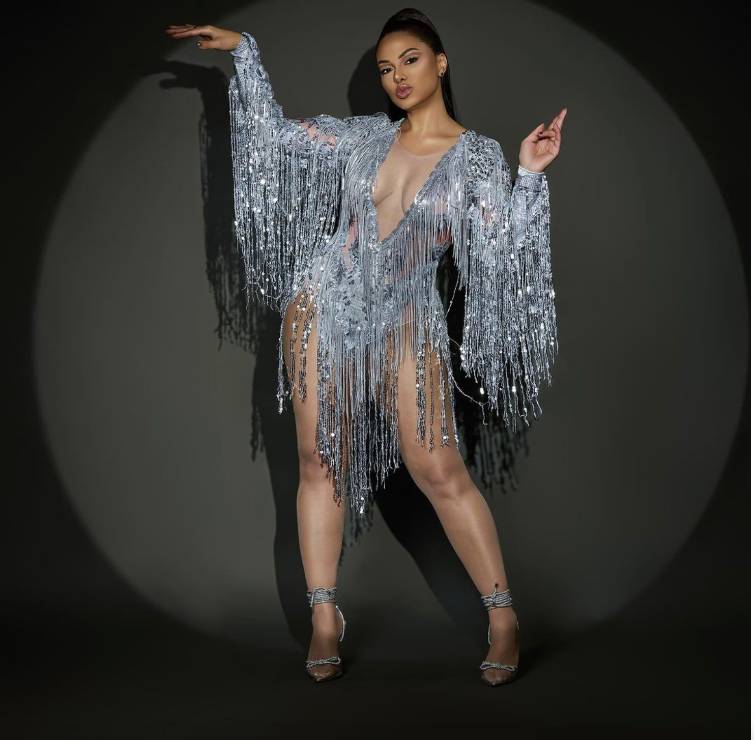 Combinaison de scène à manches longues avec franges, style cowgirl, à sequins argentés. Combinaison inspirée des costumes de scène de Las Vegas. & Costume de cosplay inspiré de JLo, manches longues argentées à franges et sequins. Taille unique. Occasions : festivals, anniversaires, mariages, Coachella, spectacles de drag queens, anniversaires, danse, festivals western, raves, spectacles à Las Vegas…