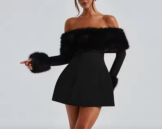 Robe mini noire à col en fourrure chic et duveteux, patchwork, mode, épaules dénudées, manches longues, coupe A, slim, pour dames, soirée, fête.