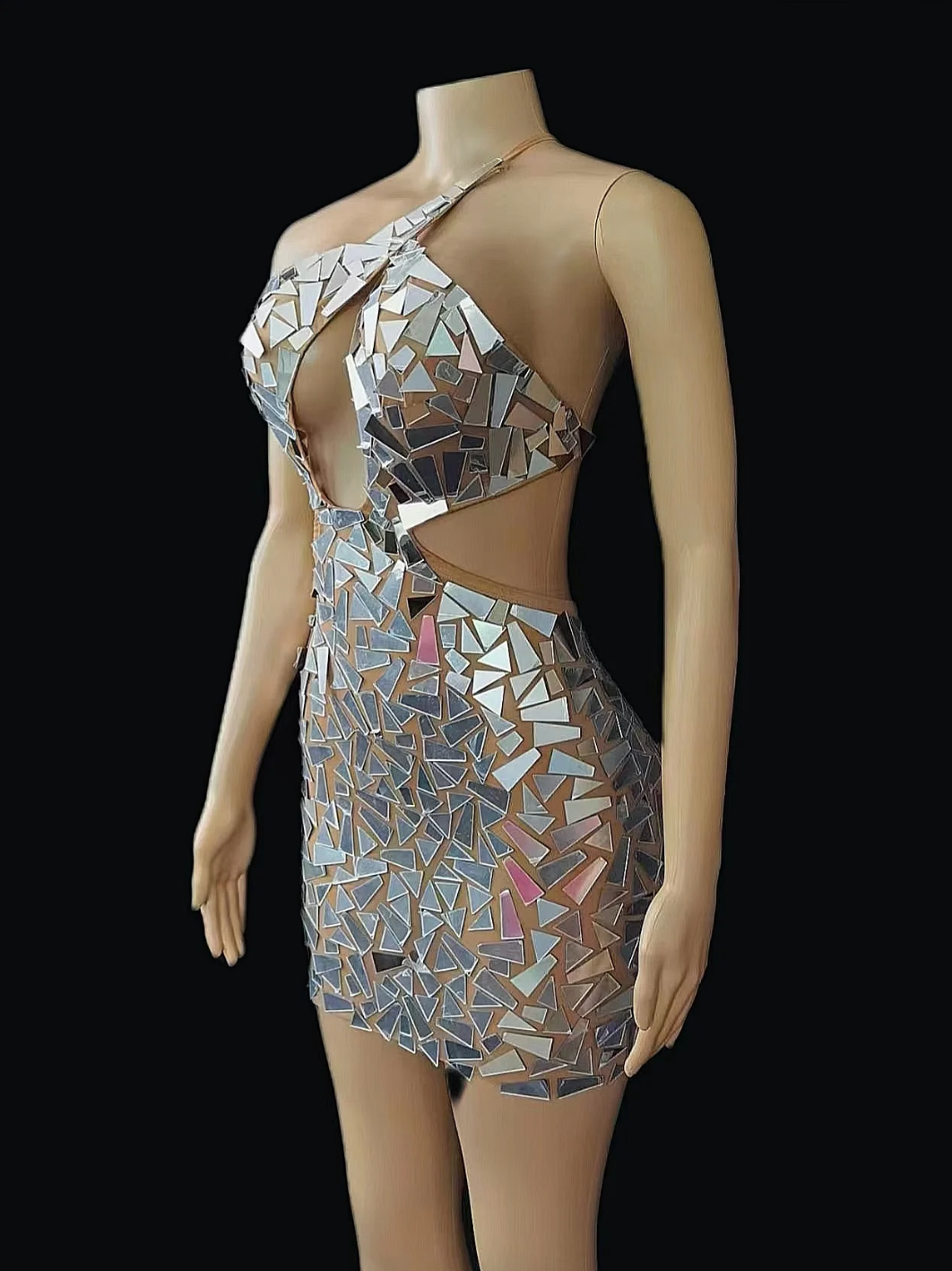 STYLE : Robe courte en cristal Robe en bodysuit métallique Robe scintillante Robe mini miroir