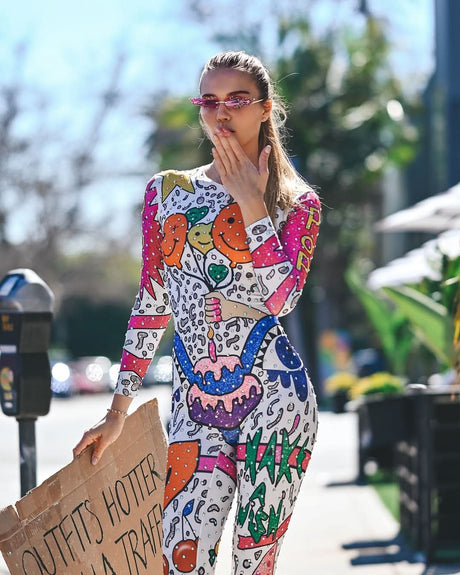 Démarquez-vous avec une confiance ludique dans ce Combinaison moulante pour femme, style dessin animé, inspirée des festivals.Conçue pour exprimer sa personnalité audacieusement et lors d'événements dynamiques, cette pièce arbore un design amusant inspiré des dessins animés et une coupe élégante et près du corps, alliant confort, élasticité et style irrésistible.