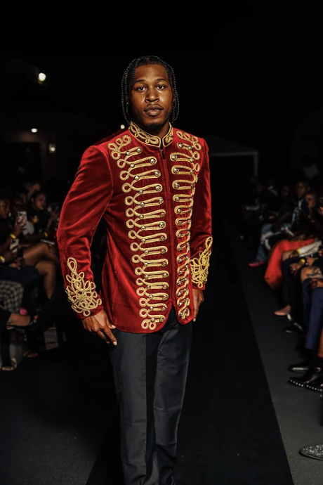 Costume de fête de styliste, veste en velours pour hommes, Blazer de smoking, Costume de fête militaire rouge et or