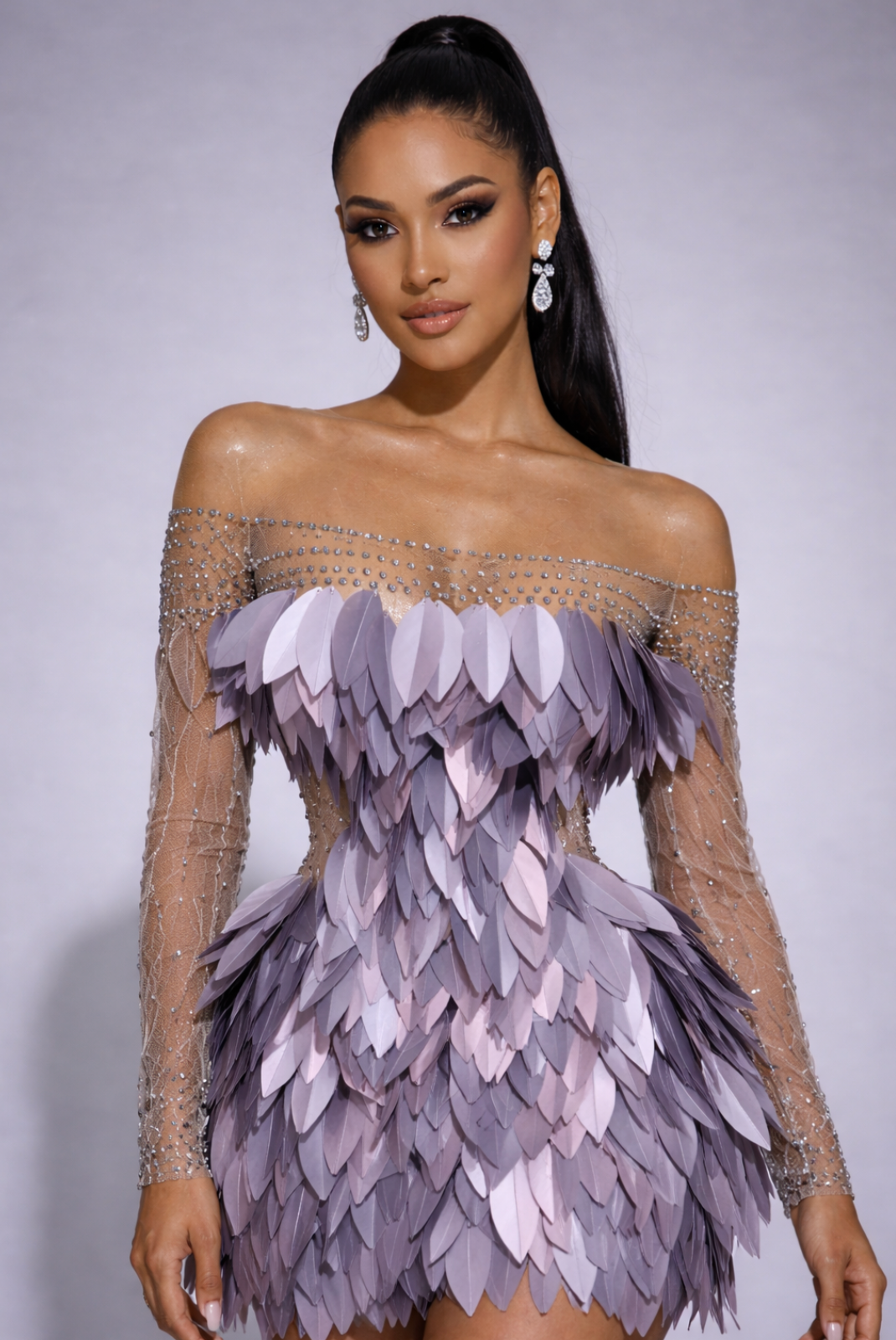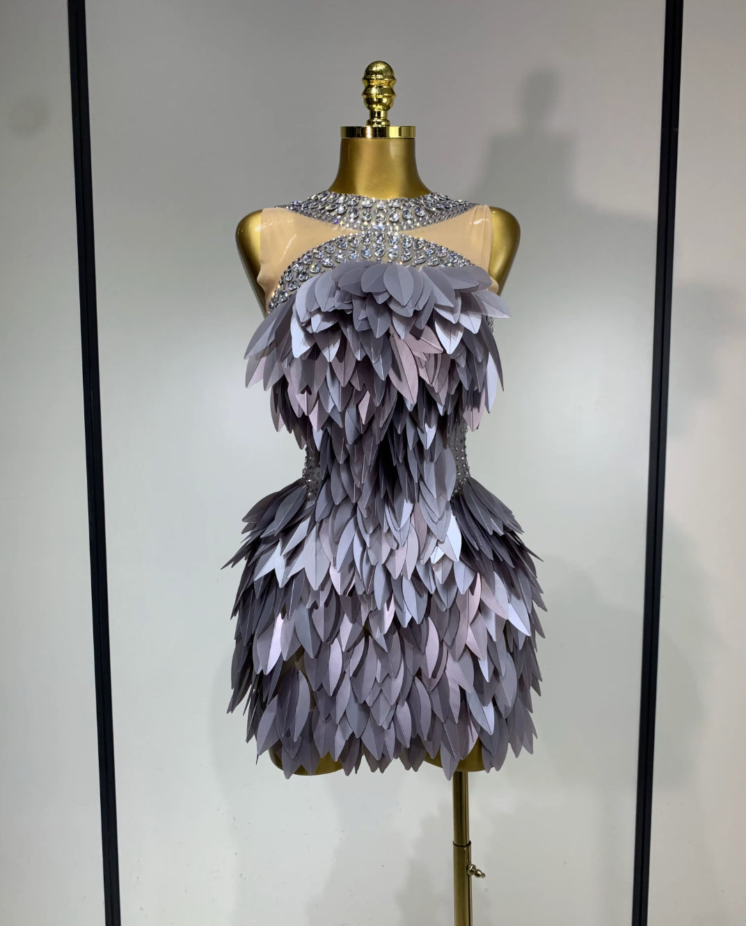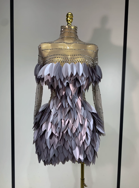 Robe Courte Grise Plumes Illusion Strass – Look de Soirée Éditorial à Manches Courtes
