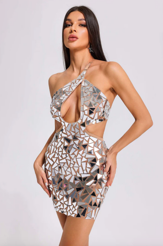 STYLE : Robe courte en cristal Robe en bodysuit métallique Robe scintillante Robe mini miroir