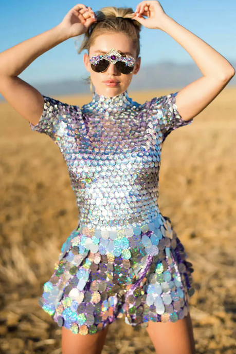 STYLE : Robe courte en cristal Robe body métallique Robe scintillante Armure Combinaison en cristal strass Sirène disponible en noir, bleu, or, argent et rose.