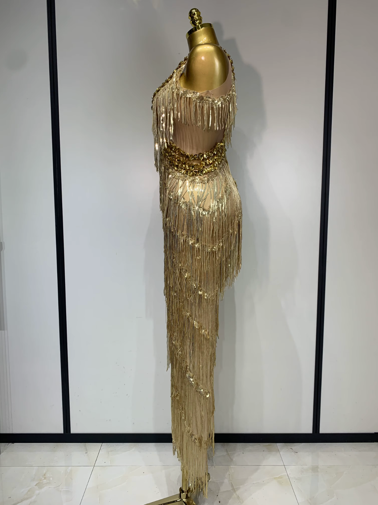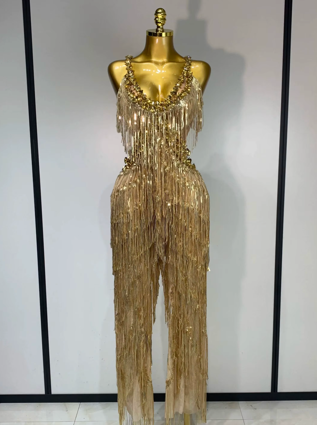 Whether you’re searching for a luxury birthday outfit, an elegant party jumpsuit, or a stage-ready performance bodysuit, this gold fringe piece delivers impact and sophistication.