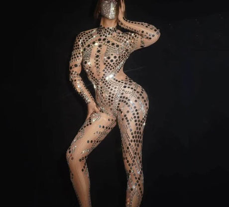 The sleek, body-hugging silhouette enhances your curves while the neutral beige base keeps the look elevated and modern. Perfect for fashion events, stage performances, photoshoots, and upscale nightlife, this party reflective mirror jumpsuit blends luxury, confidence, and show-stopping design.
